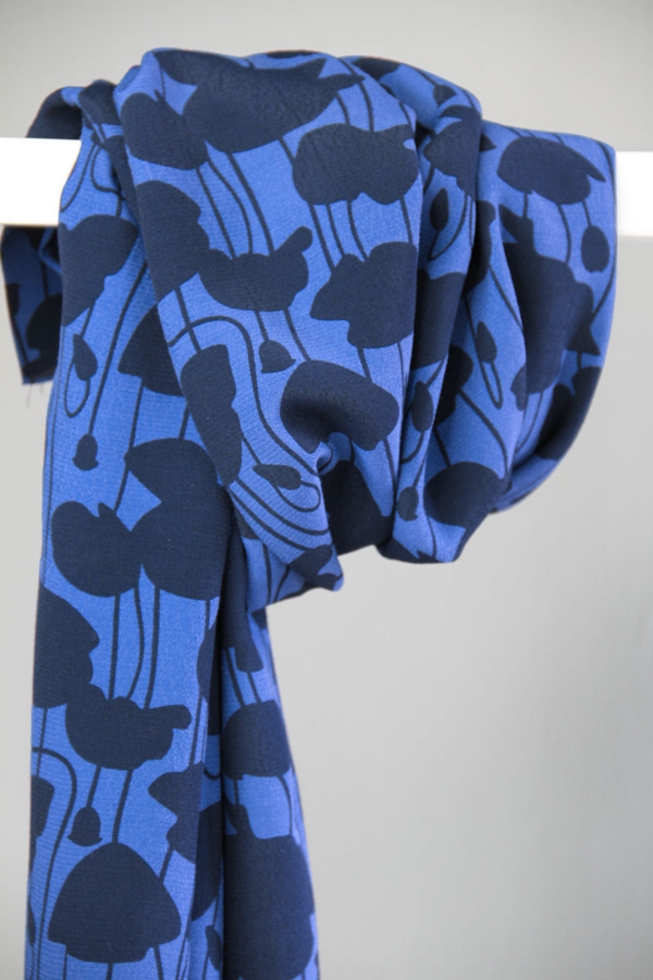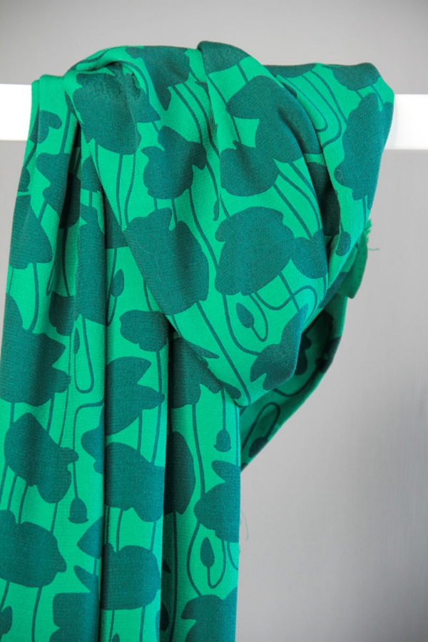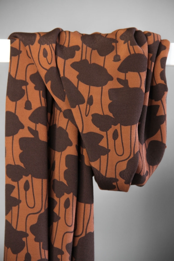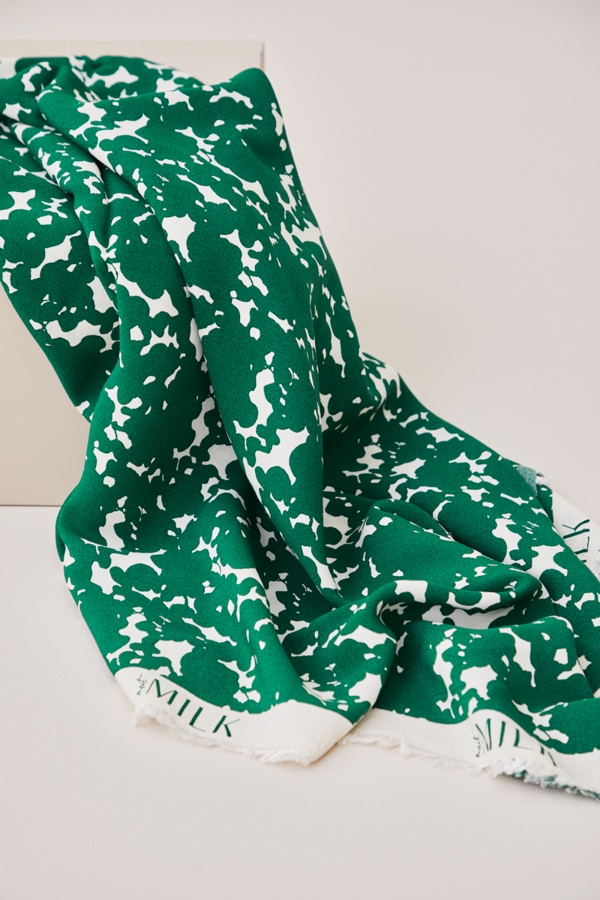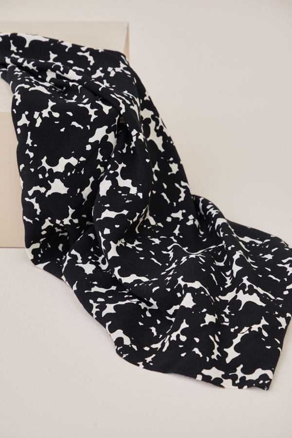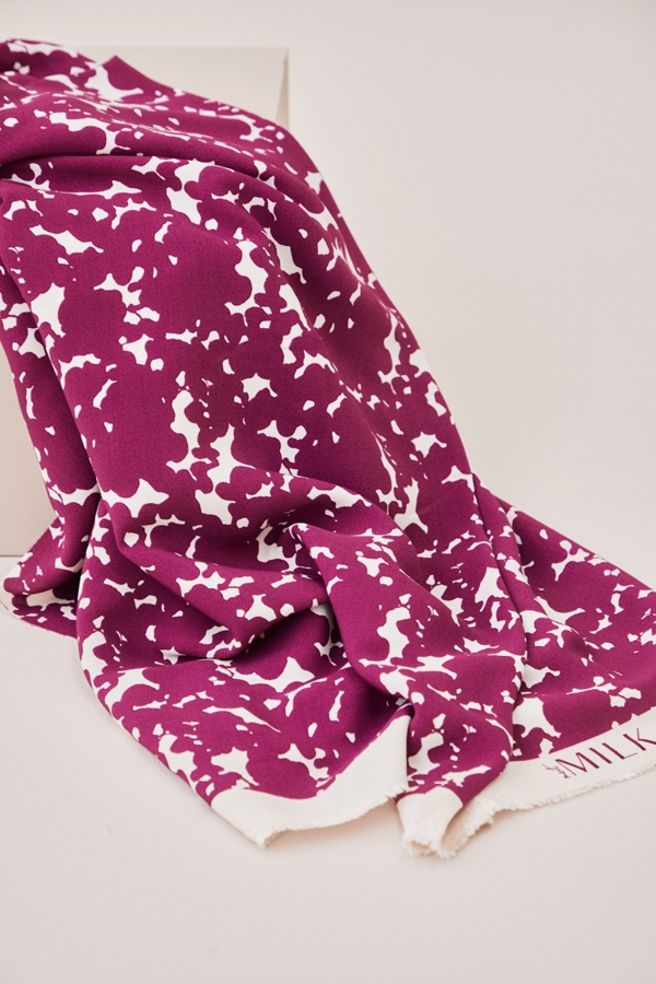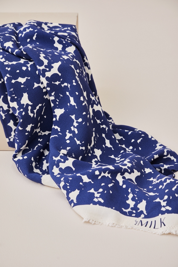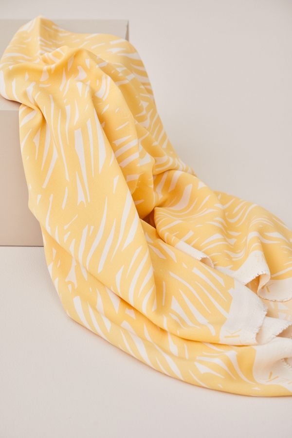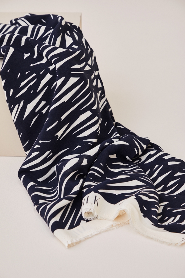 Light viscose crepe with a crisp, yet soft hand. The fabric is solid dyed in the Shell base color and rotation screen printed.